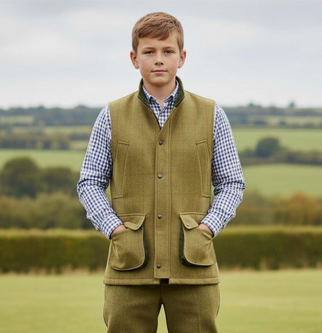 Childrens derby tweed gilet with teflon coating for extra protection and a durable finish.